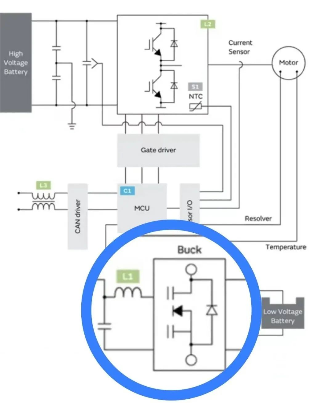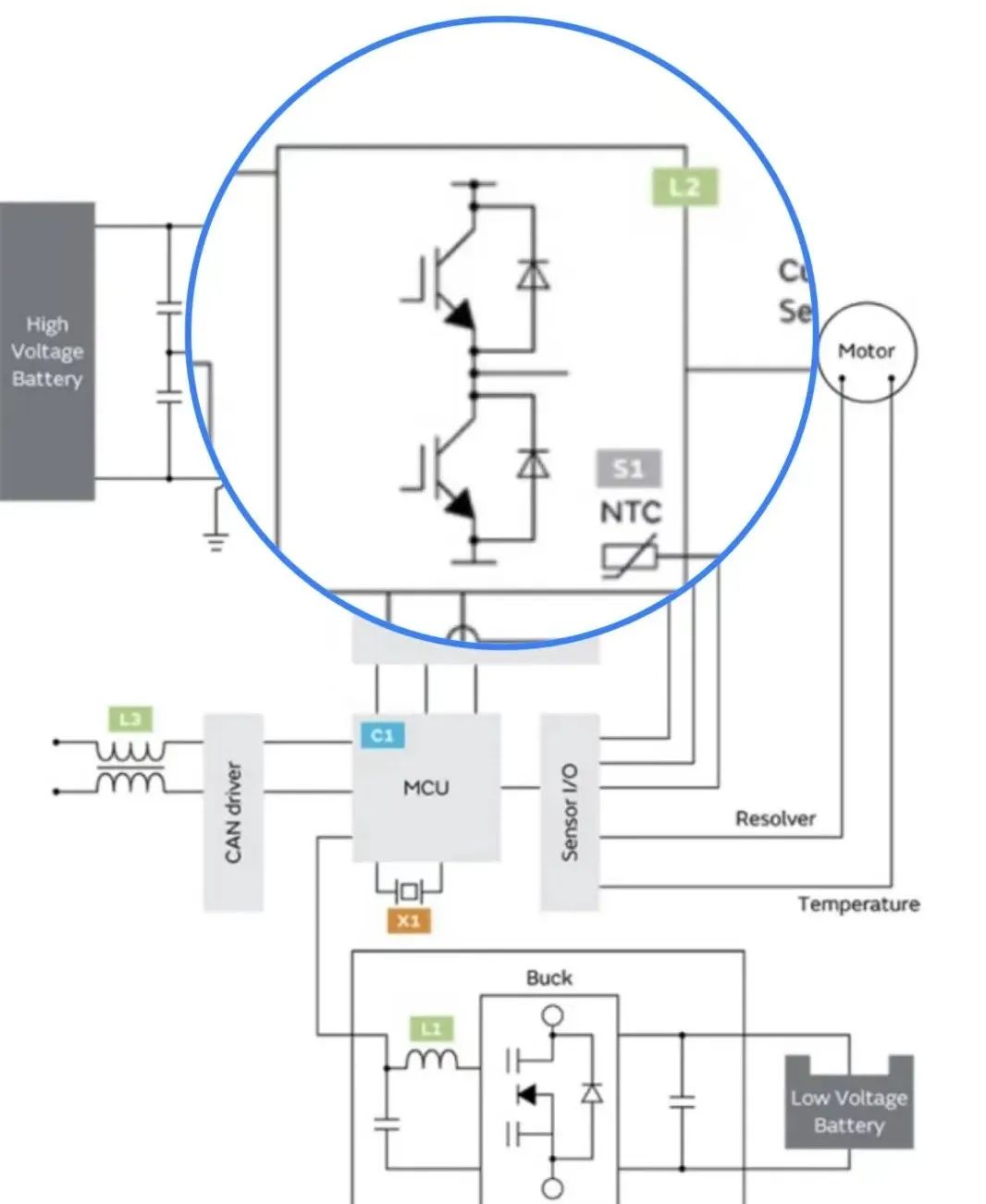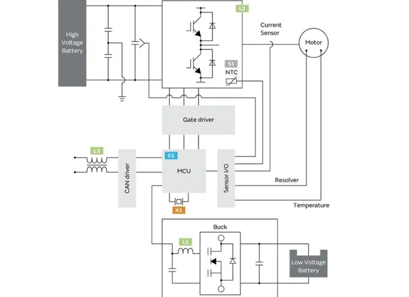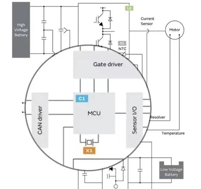 MCU主芯片控制電機,有傳感器輸入輸出,溫度檢測,電流檢測,檢測輸出端與電機工作電流的大小是否合適,通過它來調節變壓器的工作,檢測電機的工作的情況.上下級之間要進行通訊要經過車載的網關,可以理解為車載通訊的大佬-Gate Driver,它決定誰給電機供電,里面有協議,類似于通訊信號的翻譯官,信號之間要靠網關來進行翻譯,MCU對外有一個CAN Driver檢測MCU對外界通訊的接口,圖示L3處所用到共模電感進行濾波,通信信號傳輸需要用到共模電感,貼片電感等.